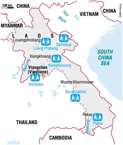 Laos, officially called Lao People's Democratic Republic, is a one-party Communist State located on the Indochinese Peninsula in South East Asia. The country borders China in the north, Vietnam in the north-east and east, Cambodia in the south, Thailand in the west and Myanmar in the north-west. Around 6.5 million people live in Laos (July 2011 est.); the capital Vientiane is the largest city and home to nearly 800,000 people (2009 est.).