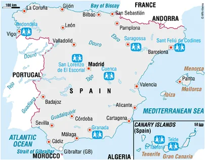 Spain is a country in Southern Europe. The country borders France and Andorra in the north-east, Portugal in the south-west and Gibraltar in the south. Across the Mediterranean Sea there are a number of Spanish enclaves which border Morocco, the biggest of which are Ceuta and Melilla.