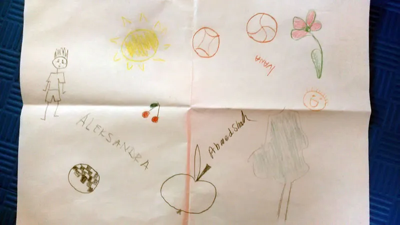In the Child Friendly Space, Ahmet relaxed. He played chess, cut collage paper and made a drawing. He enjoyed the drawing best. He drew a happy child, fruit, trees and the sun. He signed his drawing and insisted that we sign it too.