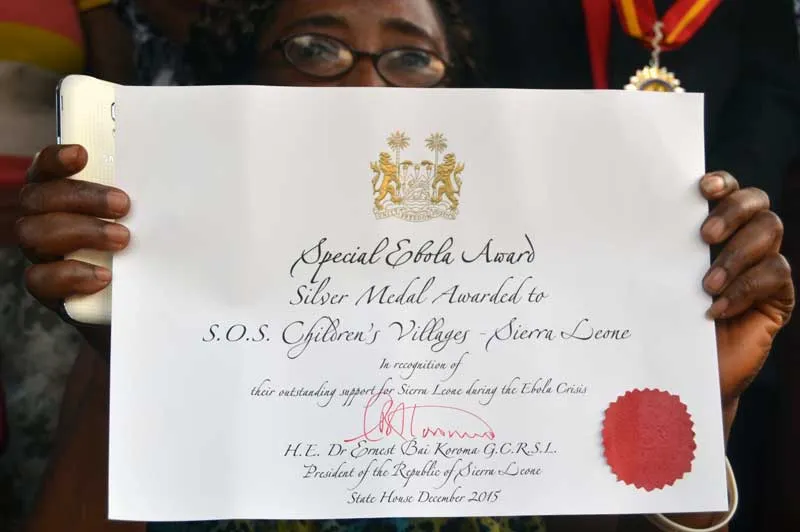 SOS Children’s Villages Sierra Leone received a silver award, “in recognition of their support to the government and people of Sierra Leone during the outbreak of the Ebola Virus Disease, especially in the rehabilitation of Observation Interim Centres and the admission of Ebola orphans,” the citation read.