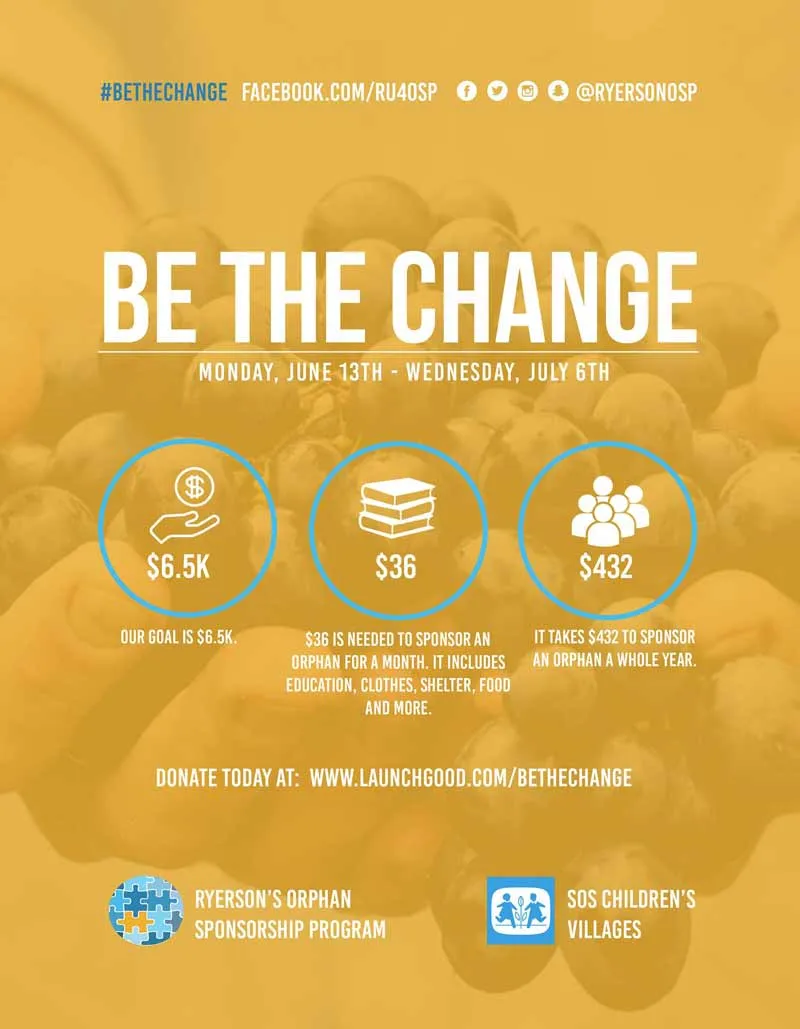 This year, inspired by the power of community spirit witnessed among students and faculty at Ryerson, Khan and his team decided to challenge themselves over the sacred month of Ramadan to see how far they could get generosity to spread by launching the #BetheChange movement – a crowdfunding project that raises money to provide children around the world with education, health care, food, shelter and much more.